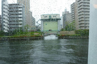 It is only a short drive south west where we drive through the Ginza area, pass in front of the Fish Market area and the Hama-rikiu Garden on our way to the Hinode Pier where we will board the boat for the Sumida River 20 minute cruise.It is still pouring rain, which definitely does not make for nice pictures.